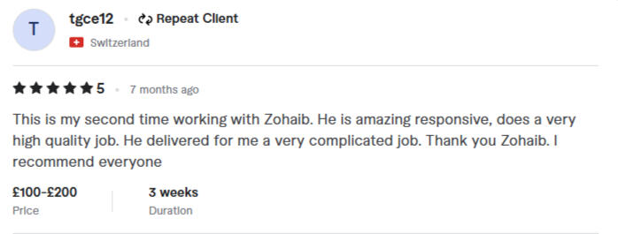 This is my second time working with Zohaib. He is amazing responsive, does a very high quality job. He delivered for me a very complicated job. Thank you Zohaib. I recommend everyone